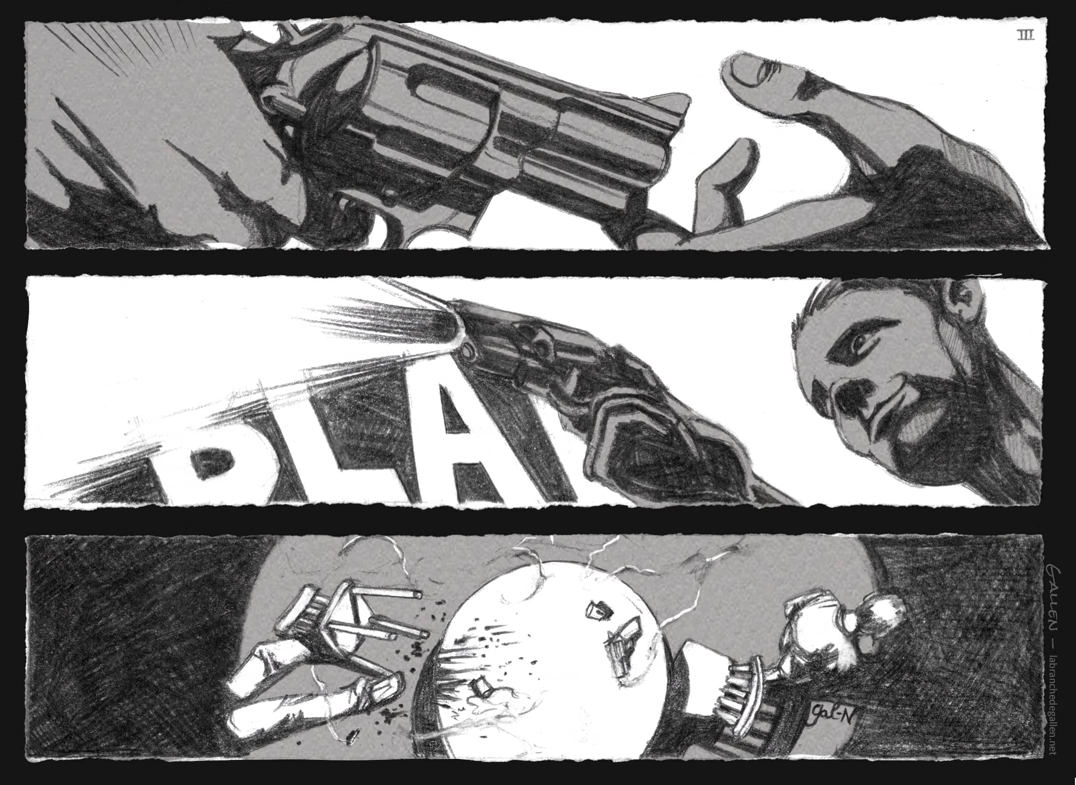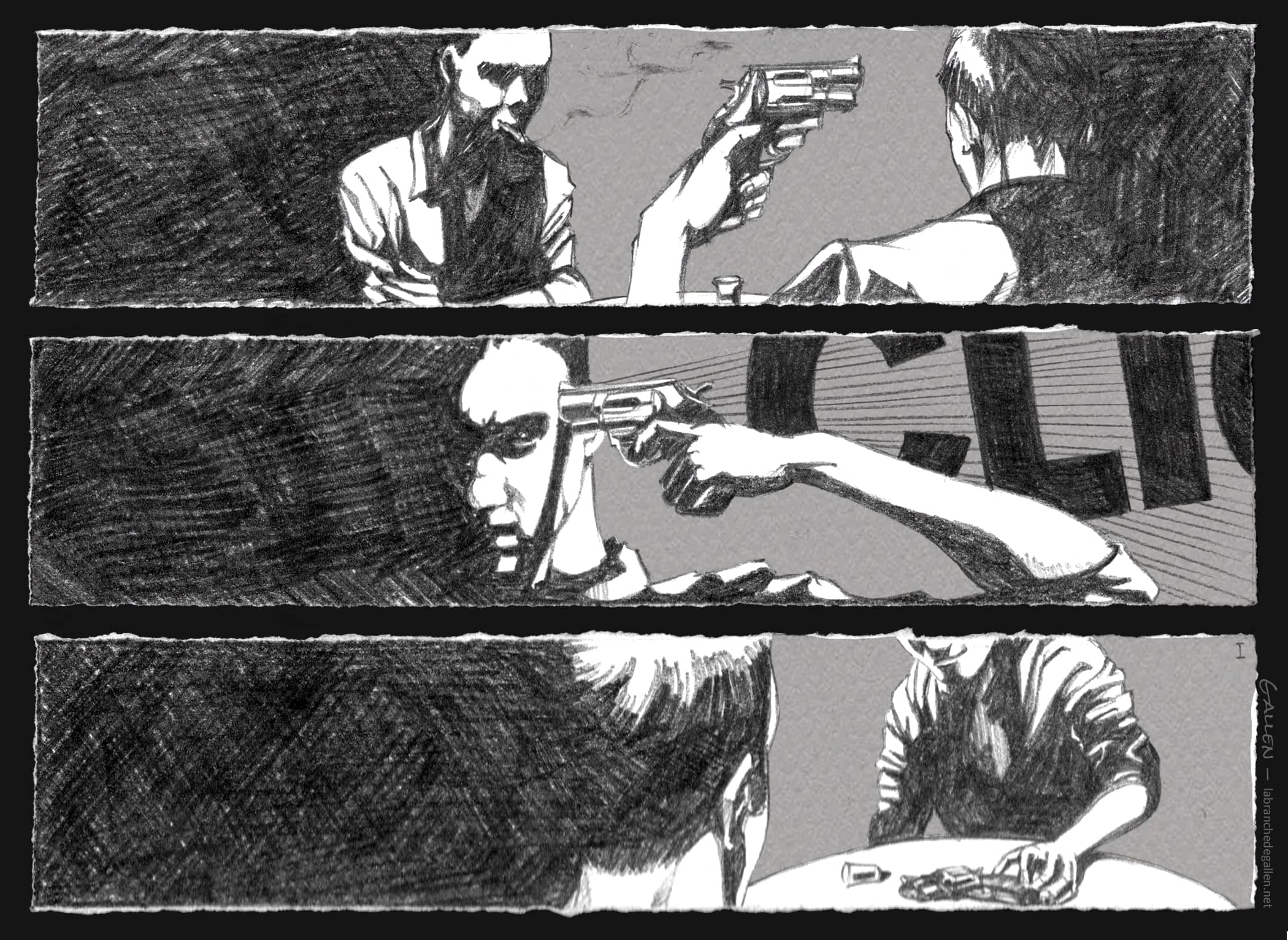 J’ai essayé de rendre hommage aux films du genre par le clair-obscur, les angles inattendus, la vision du monde mettant en scène l’absurdité de l’existence et le cauchemar fataliste. Oui, tout ça en neuf vignettes… faites au feeling à l’époque, j’avoue.